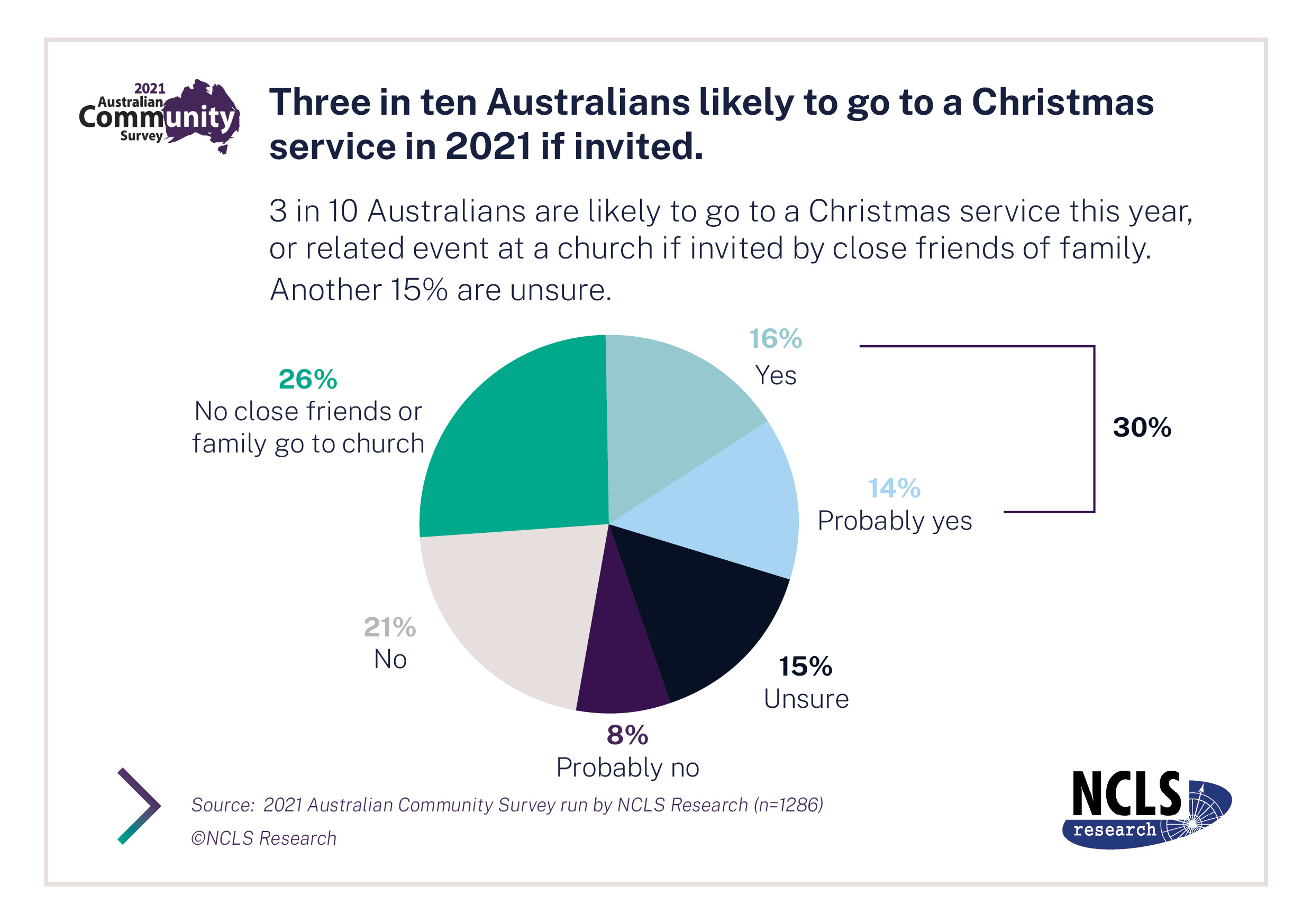The survey of 1286 people found that 3 in 10 Australians are likely to go to a church service this Christmas if invited by a close friend or family. Another 15% are unsure whether or not they would accept the invitation